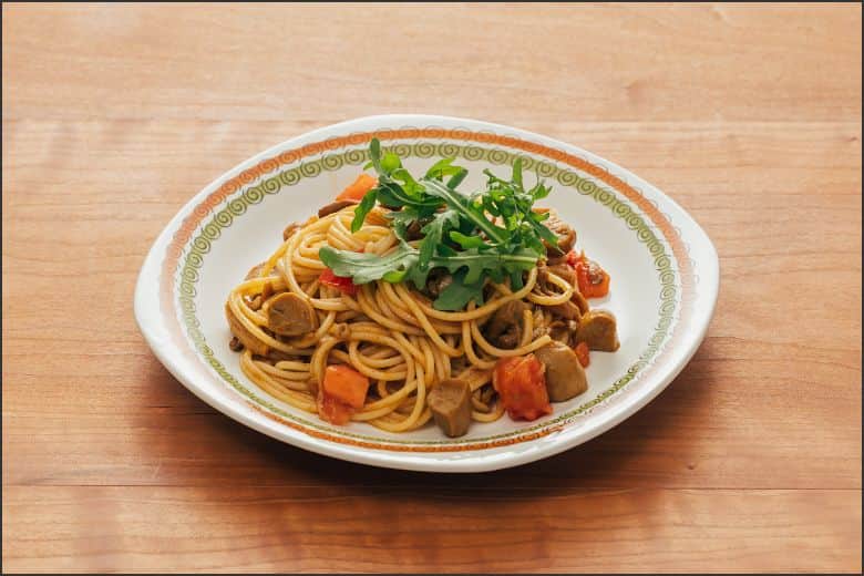 オリーブオイルときのこカレーをフライパンで火にかけそこに茹でたパスタを加えて出来上がり。